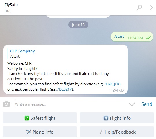 این ربات تلگرام، می‌تواند اطلاعاتی را در خصوص پرواز ایمن موجود برای مسیرهای مورد نظر شما در اختیارتان قرار دهد و علاوه بر این می‌تواند امنیت یک پرواز و امنیت هواپیمایی خاص را مشخص کند. نکته جالب اینکه نام فرودگاه‌های مطرح کشورمان (به عنوان مثال: فرودگاه مهرآباد و امام خمینی (ره) را بررسی کردیم) در این برنامه موجود بوده و ایرلاین‌های ایرانی نیز در آن ثبت شده‌اند. امنیت پروازها را براساس حوادثی که پیش از این برای آن‌ها به وقوع پیوسته بررسی و در نهایت ایمن‌ترین پرواز را برای شما مشخص می‌کند. برای استفاده از این ربات کافی است مبدا، مقصد، نام فرودگاه و زمان پرواز را وارد کنید، تا نتایج در مقابل شما قرار گیرند.