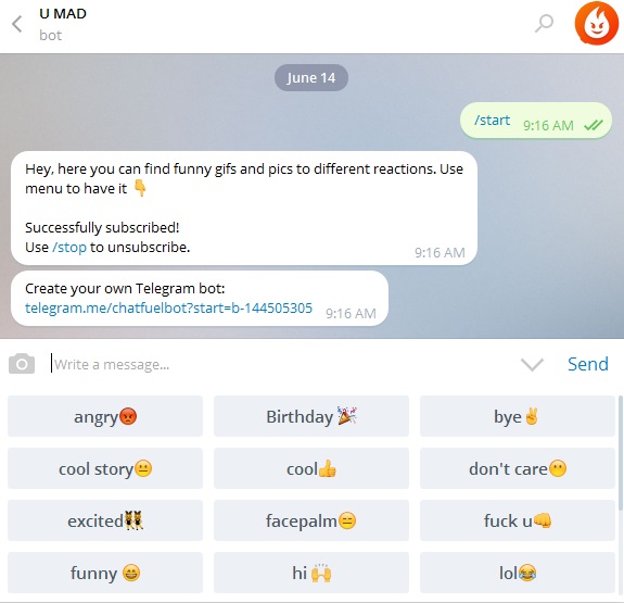 رباتی است که صرفا برای یافتن عکس و تصاویر متحرک (GIF) جالب و خندهدار برای استفاده در محیطهای گفتگو کاربرد دارد. این ربات با بهرهگیری از پایگاه دادهای متنوع توانسته در رده سوم بهترین روباتهای تلگرامی (با زبان انگلیسی) قرارگیرد.
