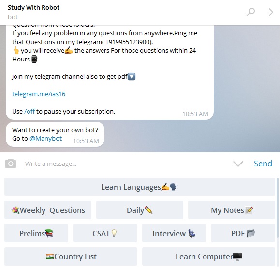 این ربات تلگرام، در واقع آچار فرانسه‌ای در خصوص آموزش مطالب مختلف به کاربران است. امکان استفاده از سرویس‌های مرتبط با فایل‌های پی‌دی‌اف، آزمون سنجش هوش، یادگیری زبان، فراگرفتن روش‌های مصاحبه، آزمون IAS، تاریخ جهان، جغرافیا و علوم موضوعاتی است که این ربات از آن‌ها پشتیبانی می‌کند.