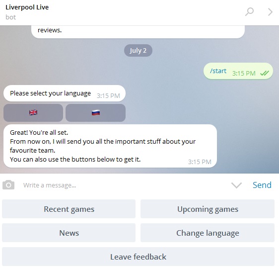 رباتی فوتبالی برای دریافت اخبار، امتیازات، بررسی و تقویم بازیهای باشگاه لیورپول است. بعد از شروع ربات، ابتدا باید زبان را انتخاب و سپس میتوانید از دکمههای مختلف برای دریافت اخبار مربوط به این باشگاه استفاده کنید.