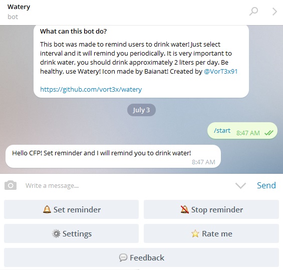 همه ما می‌دانیم که نوشیدن آب برای بدن بسیار ضروری است و روزانه براساس وزن خود باید حدود 2 لیتر آب بنوشیم. ربات تلگرامی جالب Watery، برای یادآوری نوشیدن آب به کاربران طراحی شده است. برای استفاده از ربات کافی است فاصله زمانی موردنظر خود را انتخاب کنید تا ربات در زمان مشخص شده به شما یادآوری کند.