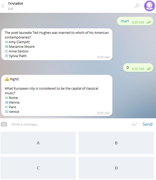 سنجش اطلاعات عمومی: با استفاده از این ربات تلگرام، میتوانید به سوالات اطلاعات عمومی در زمینههای مختلف از قبیل: ادبیات، جغرافیا، حقوق و ... پاسخ داده و اطلاعات خود را در این زمینهها از طریق پرسش و پاسخ بسنجید.