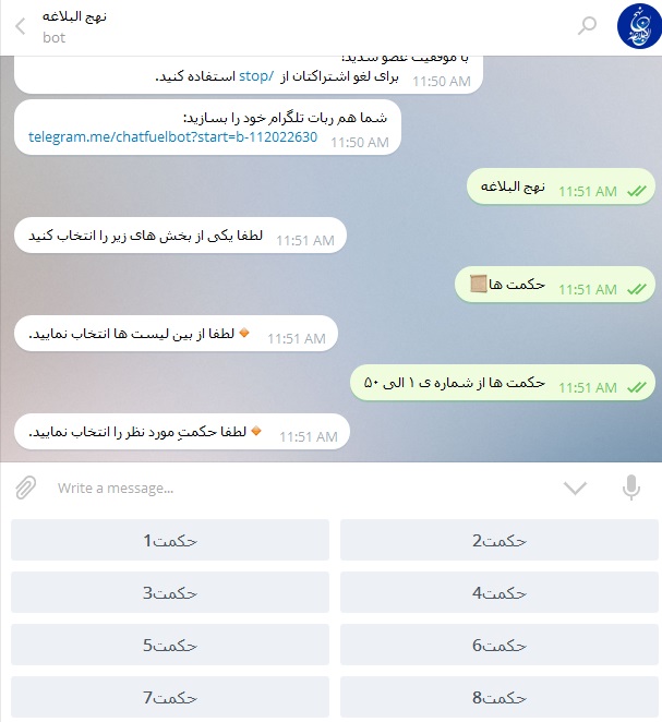 این ربات تلگرام که یکی از کاملترین و بهترین رباتهای این بخش میباشد، استفاده از نهجالبلاغه را آسان و جذاب نموده است. در این بات شما میتوانید از سه بخش حکمتها، نامهها و خطبهها استفاده نمایید. در توضیحات این ربات نوشته شده است که با پیوستن به این بات، روزانه فرازی از نهجالبلاغه را دریافت خواهید کرد.