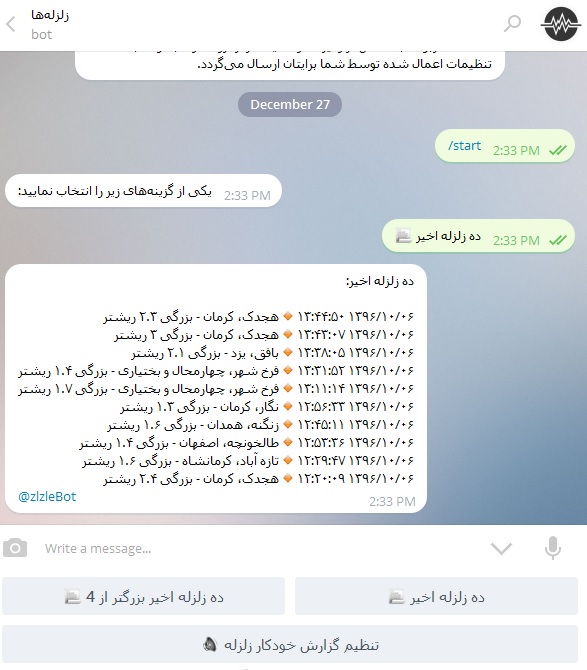 ثبت زلزله: ربات تلگرام ثبت زلزله قادر است تا ده زلزله اخیر رخ داده در کشور را به شما اعلام نماید. همچنین میتوانید ده زلزله اخیر با بزرگای بیش از 4 ریشتر را نیز به صورت جداگانه دیده و به تفکیک زمانی مشاهده نمائید.