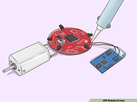 گام اول: یک دیود گیرنده مادون قرمز را به یک سِروو موتور کوچک و بورد کنترل الکترونیکی لحیم کنید. شما میتوانید این نوع بوردها را از چند منبع سختافزاری و نرمافزاری منبع باز آنلاین دسترسی پیدا کنید تا برنامههای هر گیرنده کوچک را به برنامه رباتهای گروهی بفرستید.