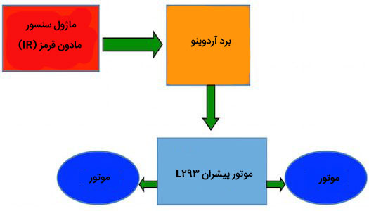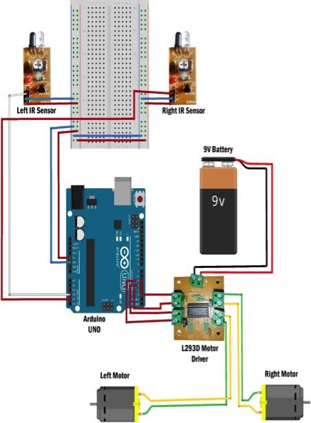 IC کنترلر موتور L293D برای کنترل دو موتور استفاده می شود. از یک موتور پیشران استفاده می شود زیرا آردوینو نمی تواند جریان کافی برای موتور پیشران فراهم کند. پین 2، 3، 4، و 5 در Arduino وارد ورودی L293D IC می شود. پین 2 و 3 سیگنال های کنترل برای موتور راست است و 4 و 5 سیگنال های کنترل برای موتور چپ است. باتری 9 ولت به موتور L293D متصل می‌شود. + 5V و GND به هر دو سنسور IR از Arduino داده می شود. خروجی های حسگر IR سمت چپ و راست به ترتیب به پین 3 و 4 آنالوگ بر روی Arduino اعمال می شود. خواندن از حسگر IR دارای مقادیر آنالوگ خواهد بود. به عنوان یک مانع مانع از سنسور، مقدار آنالوگ خروجی DOWN دیجیتال خواهد بود. خروجی از موتور پیشران (L293D) به دو موتوری که در نمودار دیده می شود، اتصال می‌یابد.