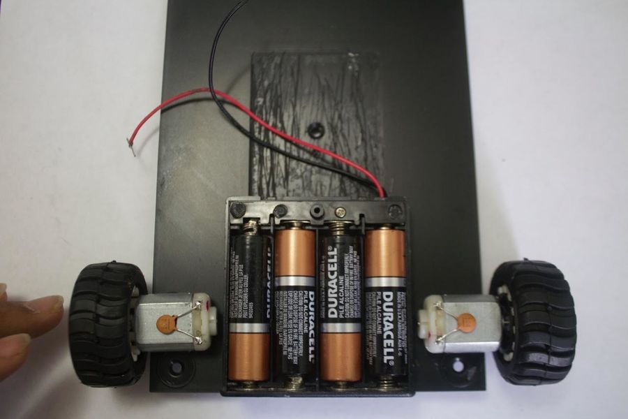 گام چهارم: الحاق مدار پیشران موتور: مدار پیشران موتور را در امتداد یک طرف شاسی قرار دهید، طوریکه سیم‌ها را بر روی لبه قرار دهید.
