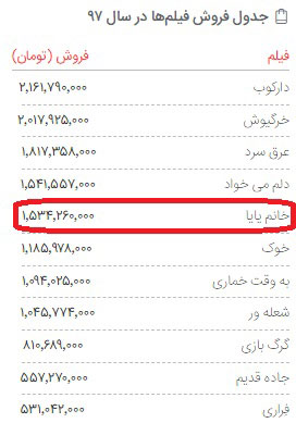 میزان فروش فیلم خانم یایا (تا تاریخ 28 آبانماه 1397)