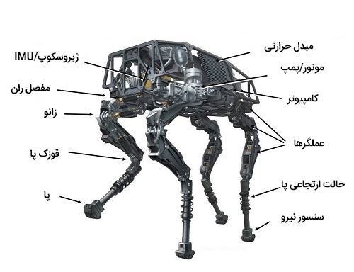 این ربات چهارپا قادر به راه رفتن، دویدن، صعود از محیطهای صعبالعبور و حمل بارهای سنگین میباشد. «سگ بزرگ (BigDog)» قدرت محرکه خود را توسط یک موتور بنزینی تولید میکند، و بر پاهائی استوار است که از پاهای حیوانات الهام گرفته شدهاند و در عین حال به نحوی طراحی شدهاند که انرژی بازتابیده از برخورد پا با سطوح سخت در هر قدم را بازیافت و به مصرف قدم بعدی میرساند. مجهز به یک پردازشگر مستقر بر روی ربات بوده که حرکت ربات، کنترل پاها و بکارگیری انواع گستردهای از حسگرها را برعهده دارد. هدایتگر ربات BigDog تلاش میکند تا پویایی رفتارهای ربات را به گونهای مدیریت نماید که ربات بتواند در وضعیتی متعادل، به حرکت، جابهجایی و رفتارهای پر انرژی خود همراه با تغییر شرایط کاری ادامه دهد. حسگرهای متعدد و متنوعی در طراحی این ربات به کار رفتهاند. حسگرهایی که اطلاعاتی از موقعیت مفاصل،نیروی وارد شونده بر مفاصل، نحوهی تماس با زمین، باری که از سوی زمین به ربات وارد میآید، ژیروسکوپ لیزری و بینایی استریو را برای سیستم پردازشگر ربات فراهم میسازند. حسگرهای دیگری نیز در این ربات به کار رفتهاند که وضعیت درونی آن را گزارش میدهند. مسائلی مانند فشار هیدرولیک، فشار روغن، دمای موتور، دور موتور، توان باطریها و سایر مسائل از این دست به وسیلهی این حسگرها گزارش میگردند.