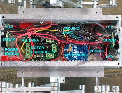 ربات Aluminalis یک ربات چندپا هوشمند بوده که هر طرف توسط یک موتور رانده میشود و چرخ دندهای را هدایت میکند که خود آن یک چرخ دنده اصلی را هدایت نموده تا یک میللنگ چهار بخشی را به وجود آورد که یک مجموعه پیچیدهای از ارتباطات را هدایت میکند. چهار بخش میل لنگ در هر طرف 90 درجه از فاز با یکدیگر است به طوری که حداقل یک جفت همیشه بر روی زمین ثابت است.