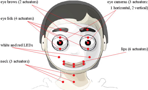 ربات Flobi یک سر رباتیک هوشمند بوده که میتواند موارد اولیه و ثانویه احساسات را به شیوهای انسانی نشان دهد. برای فعال ساختن روابط متقابل بصری انسان و ربات نیز به خوبی عمل میکند. ربات Flobi دارای وضوح بالا و استریو، زاویه دید جیروکاپی و صوتی است. سر خود دارای 18 محرک، سنسور و تابلوهای کنترل است. در ساختار هسته ربات طوری عمل شده که ابروها و لبها مطابق با عمل موردنظر فعال شوند.